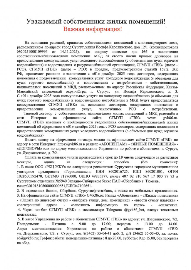Информация для собственников МКД ул. И.Каролинского д. 12/1